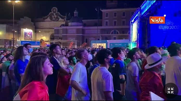 Ora…, in diretta da Piazza del Popolo a Roma, la partita finale Inghilterra-Italia iniziata alle 20.35.