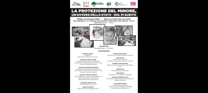 Organizzato da UDI (UNIONE DONNE), ‘Una Nessuna Centomila’ CISL, U.I.L. e Centro Italiano Femminile si terrà il Convegno dal titolo: ‘La protezione del Minore, un dovere dello Stato – DDL 91 Subito’.
