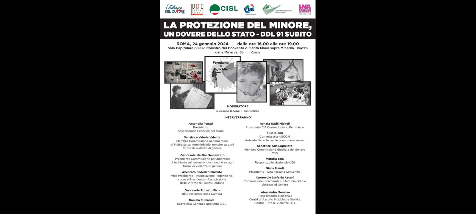 All’iniziativa si prevede la partecipazione di: ‘Riccardo lacona (giornalista e moderatore), Antonella Penati (presidente Associazione Federico nel cuore), Renata Natili Micheli (presidente CIF Centro Italiano Femminile), Elisa Giomi (commissaria AGCOM – Autorità Garante per le Telecomunicazioni), Valeria Valente (senatrice – Membro della Commissione parlamentare di inchiesta sul femminicidio, nonché su ogni forma di violenza di genere), Ada Lopreiato (senatrice – Membro Commissione Giustizia del Senato – M5S), Martina Semenzato (onorevole – presidente Commissione parlamentare di inchiesta sul femminicidio, nonché su ogni forma di violenza di genere), Vittoria Tola (responsabile Nazionale UDI), Federico Sinicato (avvocato – Vice Presidente – Associazione Federico nel cuore e presidente – Associazione delle Vittime di Piazza Fontana), Giulia Minoli (presidente Una nessuna Centomila), Stefania Ascari (onorevole – Commissione Bicamerale sul femminicidio e violenza di genere), Roberto Fico (onorevole – già presidente della Camera), Alessandra Menelao (responsabile Nazionale Centri di Ascolto Mobbing e Stalking Contro Tutte le Violenze U.I.L.), Daniela Fumarola (segretaria Generale aggiunta CISL)’!