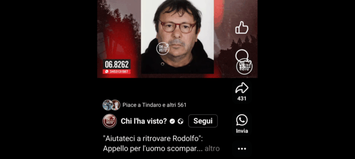 Rodolfo Tedesco ha una corporatura normale, è alto circa 170 cm, occhi castani e capelli brizzolati e al momento della scomparsa indossava una maglietta bianca, bermuda neri e scarpe nere. Un elemento preoccupante è che non ha con sé i farmaci necessari per la sua terapia e potrebbe aver perso l’orientamento.