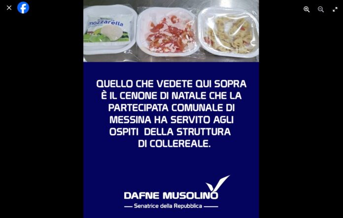 “Panem et Circenses…senza nemmeno il Panem: Sono le 22:00 del 24 dicembre e nella struttura comunale di Collereale viene servito il cenone di Natale, che è quello che vedete nella foto… pasta fredda, pomodori e mozzarella tutto regolarmente imbustato come sempre”. Lo ha scritto oggi 28 dicembre 2023 sulla sua omonima Pagina Facebook, la senatrice messinese Dafne Musolino del Gruppo di ‘Italia Viva’ presso ‘Palazzo Madama’ a Roma in merito al menù natalizio proposto presso la ex ‘Casa di Vincenzo’ situata in via Catania e gestita dai responsabili della Messina Social City.