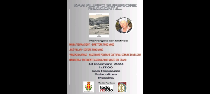 Patrocinato dal Comune di Messina, domani, mercoledì 18 dicembre, alle ore 17.00, nella sala Rappazzo del Palacultura Antonello, sarà presentato il lavoro di ricerca e memoria storica di Giusi Cardile Villari, in compartecipazione con il Comune di Messina, “San Filippo Superiore racconta…Storie di vita di un antico casale”, con Armenio editore: l’evento prevede la narrazione della Storia di San Filippo Superiore per trasmetterla come dono prezioso ai giovani, declinandola attraverso il territorio, la religiosità, le attività lavorative e la vita sociale, per apprezzare radici di semplicità tra suoni, odori e costumi di ieri.