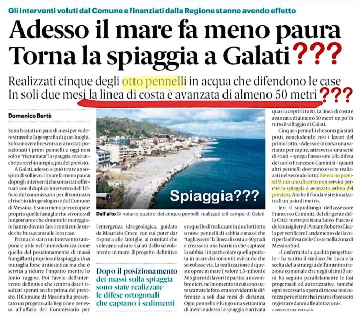 Hanno aggiunto gli scriventi: “chiunque sia il candidato o la candidata. Apprendiamo dalla Gazzetta del Sud, a firma del giornalista Domenico Bertè, che la spiaggia si è allungata di oltre 50 metri e più del previsto. Noi che a Galati Marina ci abitiamo non ce ne siamo accorti. Non possiamo che smentire questa notizia, ogni abitante di Galati Marina avrebbe potuto farlo, anche il meno attento, purtroppo nessuno degli abitanti è stato interpellato per confermare o smentire tale notizia, siamo certi che a conclusione dei lavori le case saranno più protette e finalmente potremo tornare a respirare senza muraglia, ma ad oggi non c’è nulla di tutto questo, men che meno -un allungamento della linea di costa di 50 metri-“.