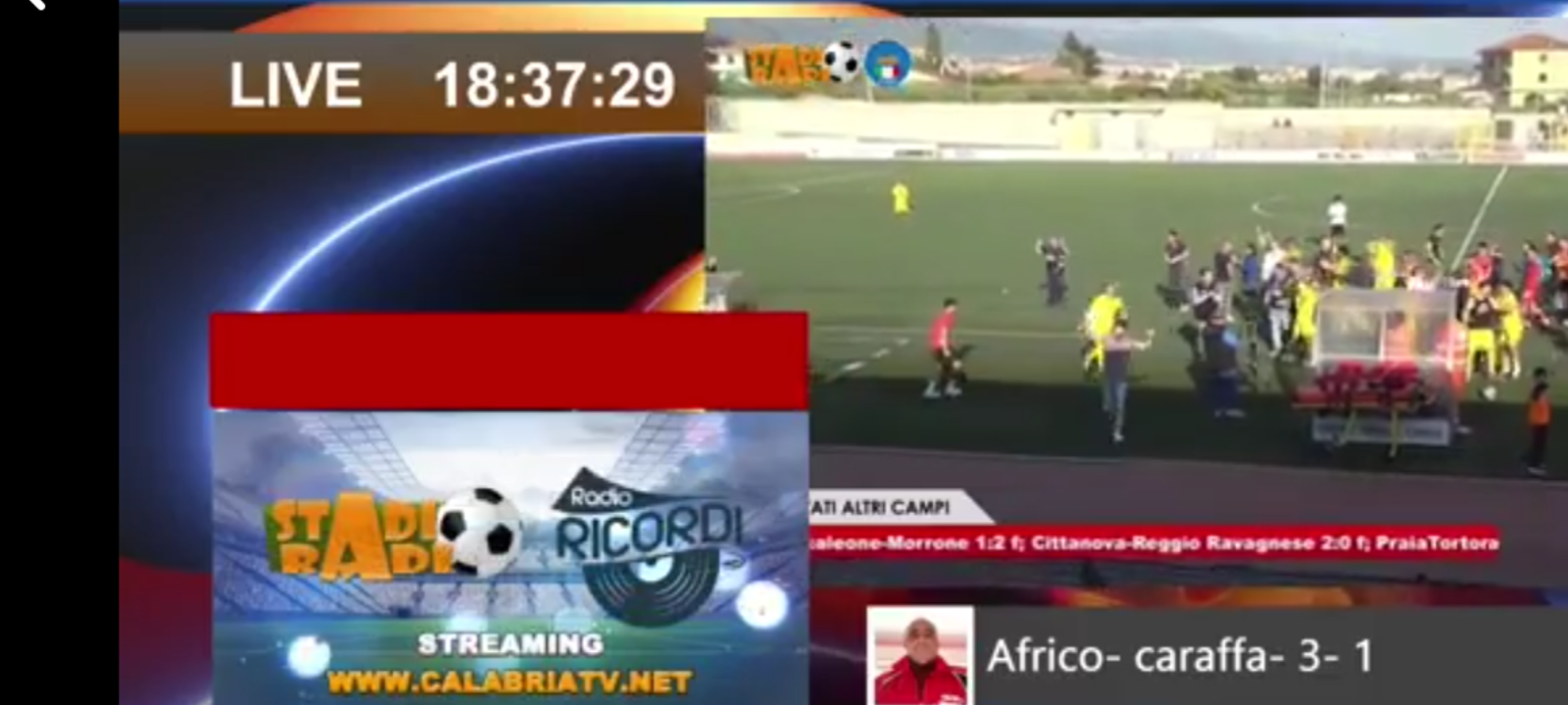 I protagonisti della giornata domenicale dagli Stadi del territorio calabrese sono stati in diretta sui ‘90.0 MHz in F. M. di Radio Ricordi’, sui 98.0 MHz in F. M. di Radio Venere di Bovalino’, sul ‘Canale 13 del Digitale terrestre di Calabria Tv’ e su… www.stadioradio.it!