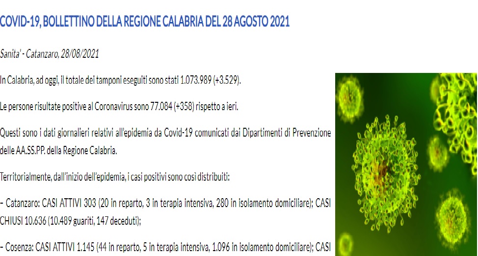 – Reggio Calabria: CASI ATTIVI 2.249 (61 in reparto, 6 in terapia intensiva, 2.182 in isolamento domiciliare); CASI CHIUSI 24.338 (23.984 guariti, 354 deceduti);