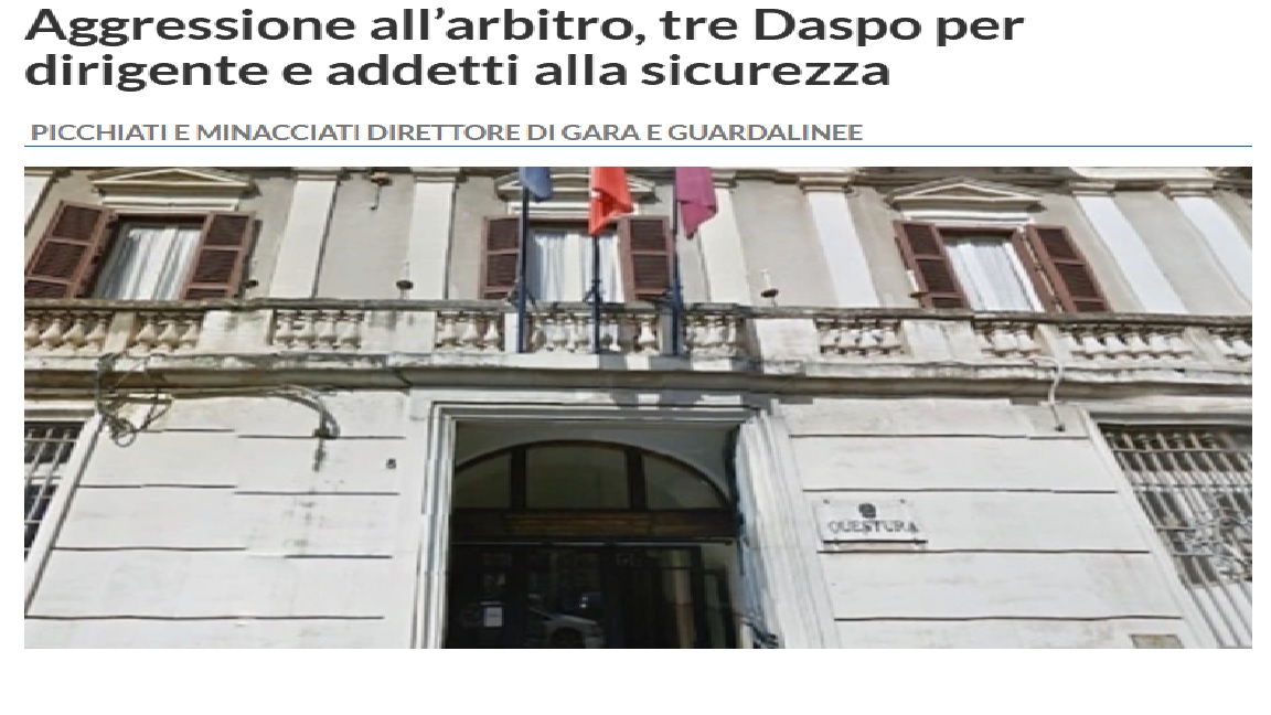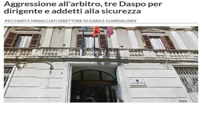 Per l’aggressione ad un arbitro nel Catanese 3 Daspo, altrettanti per due violente risse: è il bilancio degli ultimi provvedimenti adottati dal questore di Catania. La gara di calcio incriminata è quella valevole per la coppa Italia di Promozione che si è disputata lo scorso 30 aprile tra i locali del Riposto e la Supergiovane di Castelbuono.