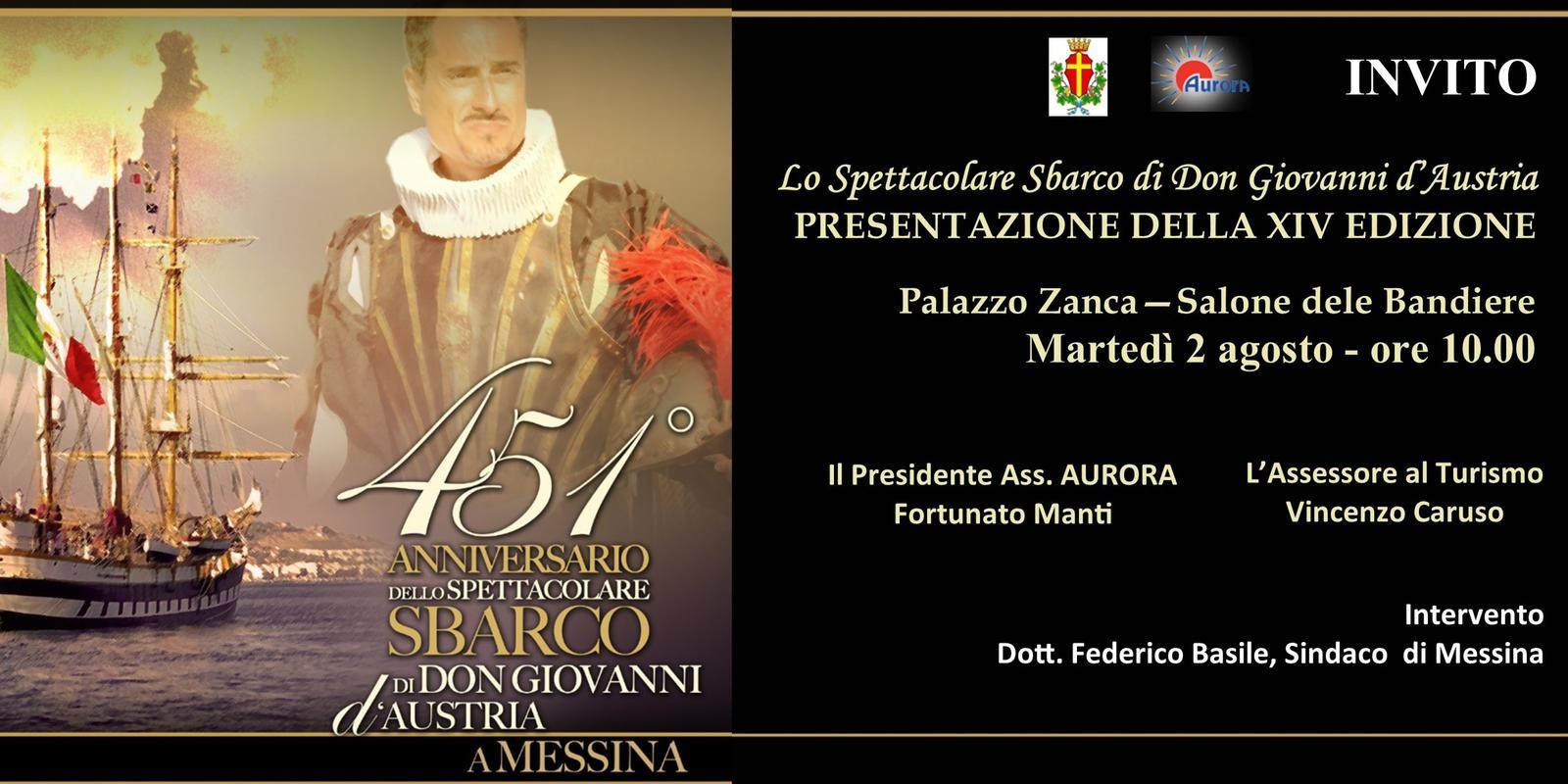 Organizzato dall’Associazione AURORA, l’evento costituisce un importante appuntamento turistico e culturale con la collaborazione di numerose realtà – tra associazioni e istituzioni, gruppi di rievocazione storica – del territorio di Messina, e la partecipazione di delegazioni di città italiane e internazionali. La Rievocazione dello Sbarco di Don Giovanni d’Austria, giunta alla sua XIV edizione, alla quale è stato riconosciuto il patrocinio del Ministero dei Beni Culturali, si inserisce nelle manifestazioni del network internazionale “Sulle Rotte di Lepanto. Dallo Scontro all’Incontro”, a cui aderiscono oltre Messina, Venezia e Lepanto, città italiane ed estere. Anche quest’anno, come già avvenuto nel 2012 e nell’edizione del 2019, sarà presente la nave scuola Palinuro, unità a vela della Marina Militare, che sarà a Messina mercoledì 3 agosto e rappresenterà la “Real” di Don Giovanni d’Austria.