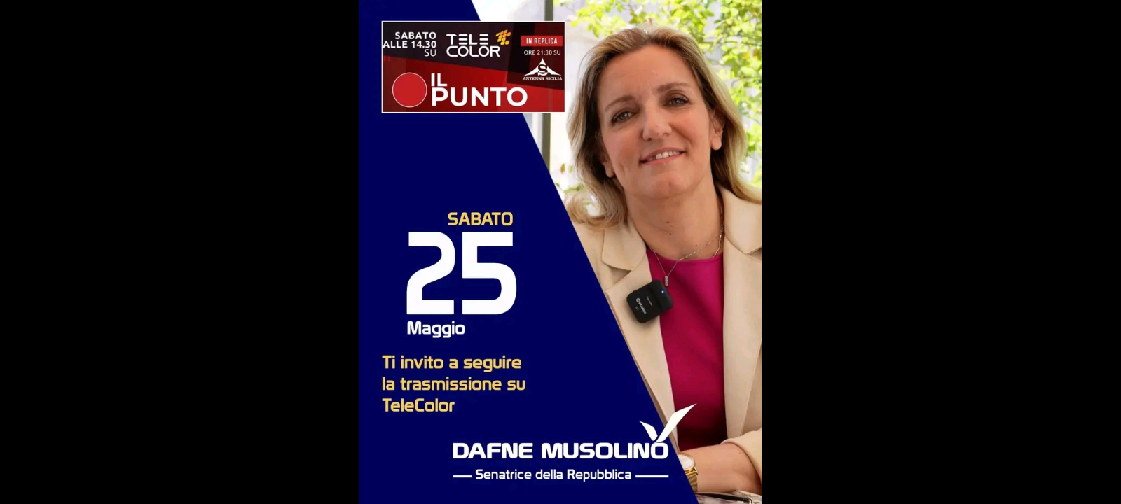 “Prima di tutto ti auguro un buon Sabato e ti invito a seguire la trasmissione su Telecolor, dove sono ospite di Luca Ciliberti: Si tratta della penultima trasmissione prima del silenzio elettorale che andrà in onda alle 14:30 e poi in replica alle 21:30 su Antenna Sicilia Nuova”. Lo ricorda in un Post di oggi 25 maggio 2024 pubblicato sulla sua omonima Pagina Facebook, l’avvocato Dafne Musolino, senatrice messinese presso ‘Palazzo Madama’ a Roma del ‘Gruppo di Italia Viva’.