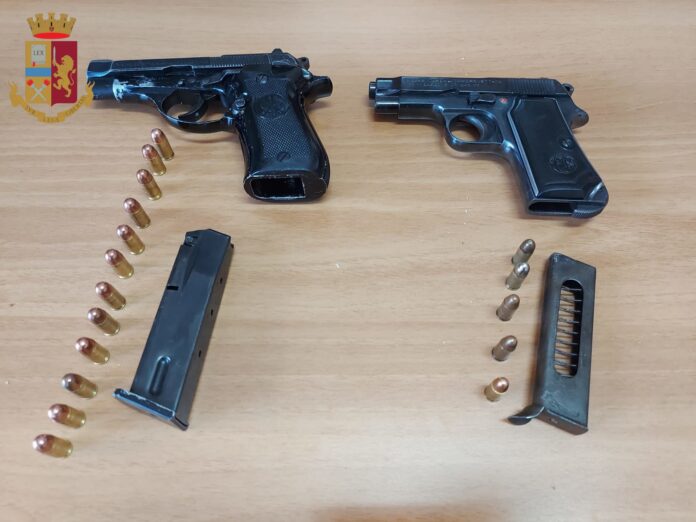 Mentre la macchina ripartiva, seguita a distanza da una pattuglia della Polizia di Stato, se ne avvicinavano immediatamente altre per consentire un controllo in sicurezza della persone a bordo. Il fiuto dei poliziotti ha permesso così di rinvenire, in possesso a 2 di loro, e successivamente sequestrare, 2 pistole, di cui una con matricola abrasa e 2 caricatori con complessivi 17 colpi. La pistola con la matricola leggibile è risultata anch’essa clandestina, in quanto non censita nella banca dati delle forze dell’ordine. Al termine delle indagini, I.A e D.A, romani, rispettivamente di 29 e 37 anni, sono stati arrestati per porto abusivo di armi e condotti presso la casa circondariale di Viterbo. Inoltre il conducente dell’autovettura è stato denunciato poiché sprovvisto della patente di guida.