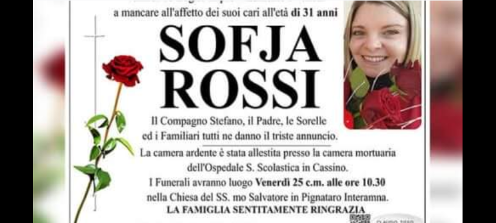 I funerali di Sofja Rossi si sono tenuti venerdì 25 luglio 2025 alle ore 10.30, nella Chiesa del SS.mo Salvatore a Pignataro Interamna. È stato un momento di raccoglimento e preghiera per salutare un’anima giovane e luminosa, volata via troppo presto.
