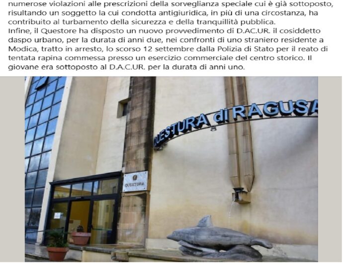 Inoltre è stata avanzata al Presidente del Tribunale di Ragusa – Sezione Misure di Prevenzione – la proposta di aggravamento della misura di prevenzione della Sorveglianza Speciale con Obbligo di Soggiorno nel comune di residenza nei confronti di un tunisino autore di numerosi reati in materia di stupefacenti e numerose violazioni alle prescrizioni della sorveglianza speciale cui è già sottoposto, risultando un soggetto la cui condotta antigiuridica, in più di una circostanza, ha contribuito al turbamento della sicurezza e della tranquillità pubblica. Infine, il Questore ha disposto un nuovo provvedimento di D.AC.UR. il cosiddetto Daspo Urbano, per la durata di anni due, nei confronti di uno straniero residente a Modica, tratto in arresto, lo scorso 12 settembre dalla Polizia di Stato per il reato di tentata rapina commessa presso un esercizio commerciale del centro storico. Il giovane era sottoposto al D.A.C.UR. per la durata di anni uno.