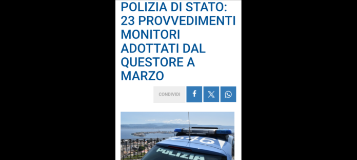 Prosegue senza sosta l’attività di prevenzione dei reati della Questura di Messina a seguito dell’accurata analisi, operata dalla Divisione Anticrimine, dei fenomeni di violenza urbana e delle condotte illecite da parte di soggetti ritenuti socialmente pericolosi, nei cui confronti sono stati adottati, nel mese di marzo, i seguenti provvedimenti.