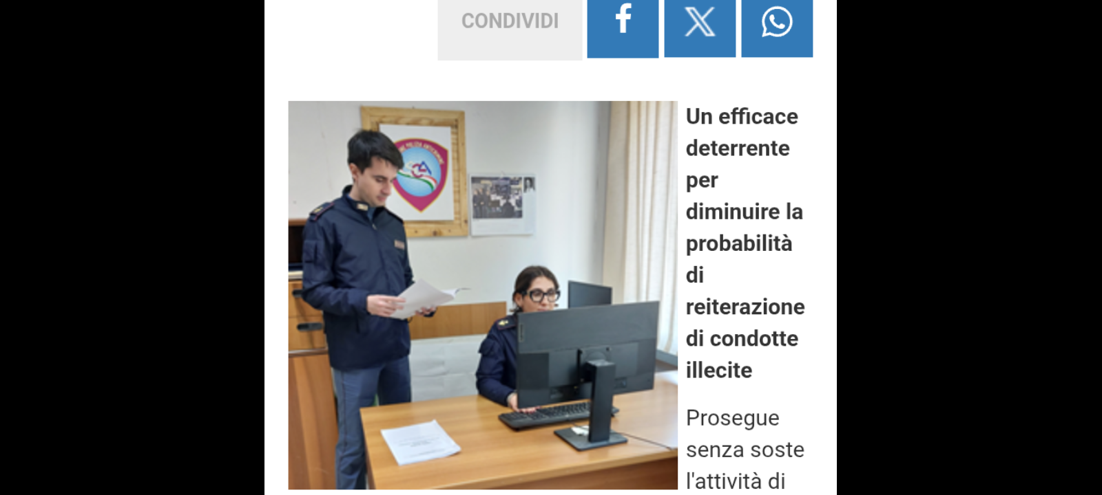 In particolare, sono stati disposti: – due Divieti di accesso ai luoghi dove si svolgono manifestazioni sportive (“Daspo”) per anni uno, nei riguardi di altrettanti soggetti che hanno posto in essere condotte violente nell’ambito di campionati di calcio minori; – sei “avvisi orali”, intimando a tutti gli interessati di tenere una condotta conforme alla legge; – un provvedimento di “foglio di via obbligatorio” dal Comune di Reggio Calabria, nei confronti di un soggetto residente in Campania, indiziato di una truffa ai danni di una persona anziana, inibendo di farvi ritorno per un periodo di due anni; – sette provvedimenti di “ammonimento” nei confronti di altrettanti soggetti che si sono resi autori di atti persecutori e violenza domestica.