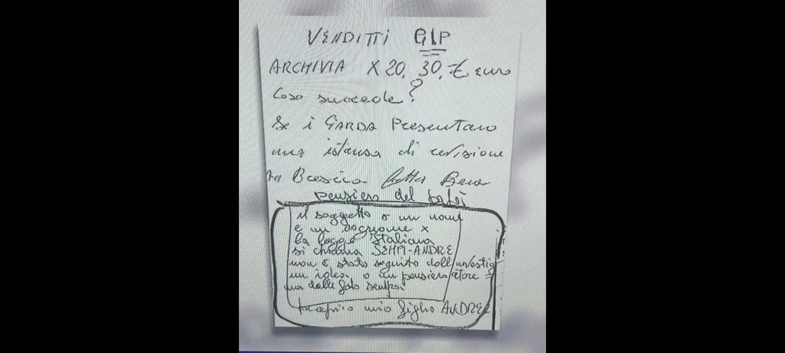 - “In sostanza… il padre di Sempio si segna i soldi da dare per archiviare il caso di Andrea ma poi si chiede cosa succederebbe se Stasi dovesse chiedere di riaprire il suo caso (Possono ripuntare su suo figlio Sempio?). La seconda parte sembra un appunto mentre si parla al telefono. Pare un’altra mano, femminile. Si parla di una foto in cui c’è Andrea ‘mio figlio’. Quindi lo avrà scritto la madre. Penso si riferisca alle foto scattate dall’investigatore privato che aveva seguito Sempio per prendergli il dna. Molto strano che i Sempio avessero accesso a quel fascicolo, secretato”.