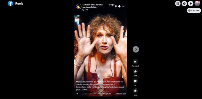 LO HA EVIDENZIATO OGGI 26 AGOSTO 2023 SULLA SUA OMONIMA PAGINA FACEBOOK, LA CANTANTE FIORELLA MANNOIA RIFERENDOSI ALLA MANIFESTAZIONE DENOMINATA... 'LA NOTTE DELLA TARANTA'