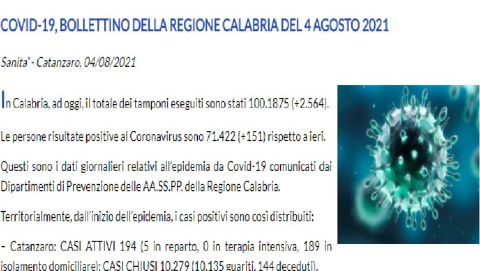 In Calabria, ad oggi, il totale dei tamponi eseguiti sono stati 100.1875 (+2.564). Le persone risultate positive al Coronavirus sono 71.422 (+151) rispetto a ieri.