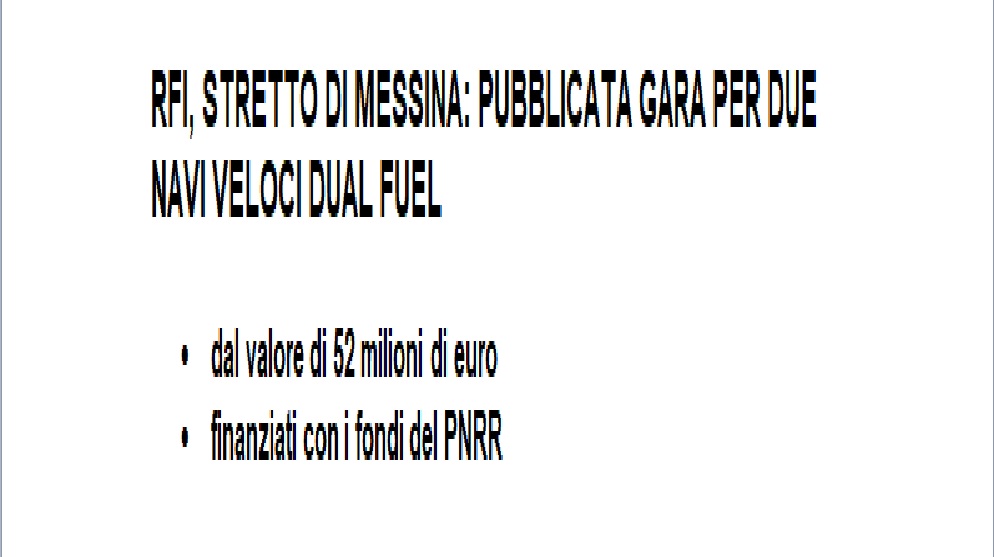 Rete Ferroviaria Italiana (Gruppo FS Italiane) ha pubblicato sulla Gazzetta ufficiale dell’Unione europea (GUUE) la gara per la fornitura di due navi veloci dual fuel per lo stretto di Messina, per offrire servizi di traghettamento sempre più green.