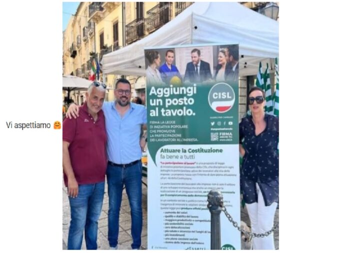 “Ritorna il tour di #unpostoaltavolo, il gazebo della Cisl per la raccolta firme per la legge di iniziativa popolare sulla partecipazione al lavoro”. Ne danno notizia, in una nota di oggi 25 settembre 2023, i responsabili del Sindacato ‘Confederazione italiana sindacati lavoratori’… afferenti alla Sede Provinciale di Messina!
