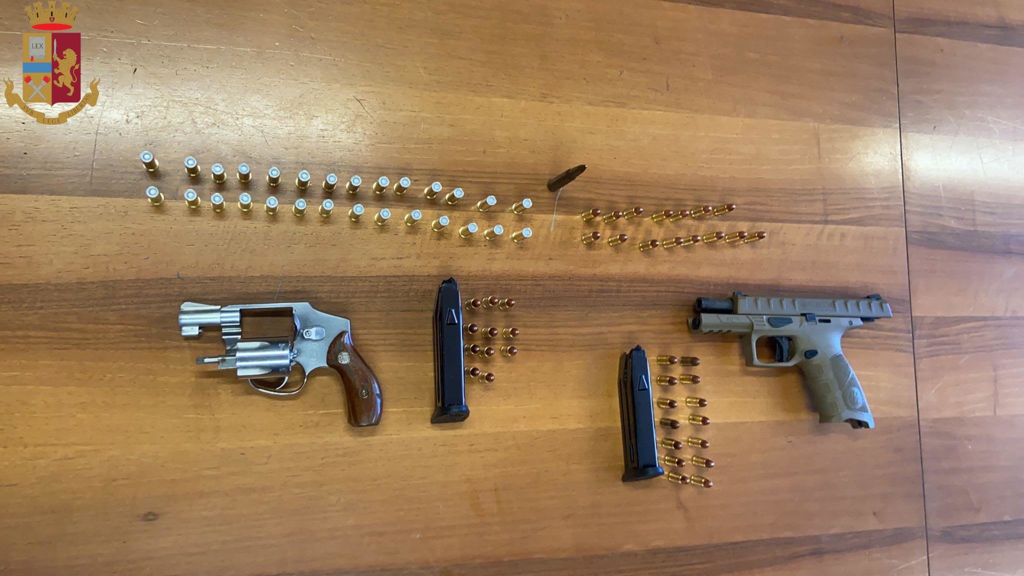 Alle prime ore dell’alba del giorno 13 le squadre giudiziarie dirette da Eugenio Ferraro e Stefania D’Andrea hanno atteso che la coppia accompagnasse il loro figlio a scuola per poi fermarla e perquisire la loro abitazione. Durante la perquisizione all’interno di un vano ricavato nel materasso del letto matrimoniale sono state rinvenute due pistole: una beretta mod. APK cal. 9×21 e una pistola a tamburo mod. revolver marca Smith e Wesson cal 38. Sono state sequestrate inoltre due cartucce compatibili con le due armi da fuoco.