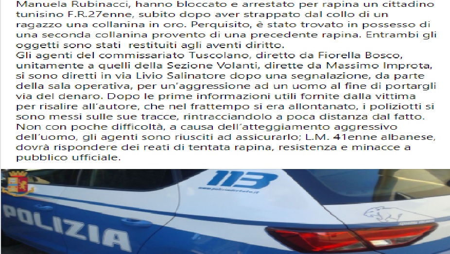 Gli agenti del commissariato Tuscolano, diretto da Fiorella Bosco, unitamente a quelli della Sezione Volanti, dirette da Massimo Improta, si sono diretti in via Livio Salinatore dopo una segnalazione, da parte della sala operativa, per un’aggressione ad un uomo al fine di portargli via del denaro. Dopo le prime informazioni utili fornite dalla vittima per risalire all’autore, che nel frattempo si era allontanato, i poliziotti si sono messi sulle sue tracce, rintracciandolo a poca distanza dal fatto. Non con poche difficoltà, a causa dell’atteggiamento aggressivo dell’uomo, gli agenti sono riusciti ad assicurarlo; L.M. 41enne albanese, dovrà rispondere dei reati di tentata rapina, resistenza e minacce a pubblico ufficiale.