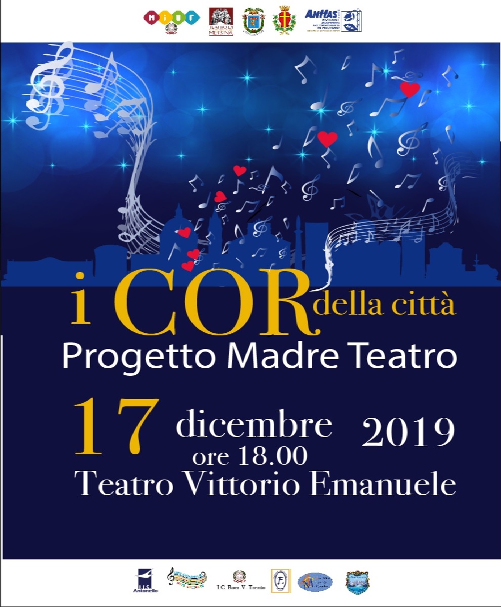 Sabato 14 dicembre 2019 alle ore 11 nella Sala Sinopoli del Teatro Vittorio Emanuele sarà presentata la manifestazione “i COR della città” – Progetto Madre Teatro organizzata dal MIUR in collaborazione con l’E.A.R. Teatro di Messina, il Comune di Messina, La Città Metropolitana e l’Anffas.
