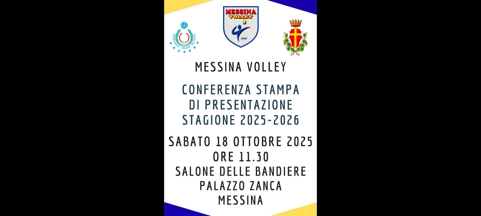 “Sabato 18 ottobre 2025 alle 11.30, si terrà la conferenza stampa di presentazione della stagione 2025-26 del Messina Volley”. Lo si evince, da una nota diffusa nelle ore scorse dai responsabili della Associazione Sportivo Dilettantistica che è proprietaria della Squadra… Messina Volley.