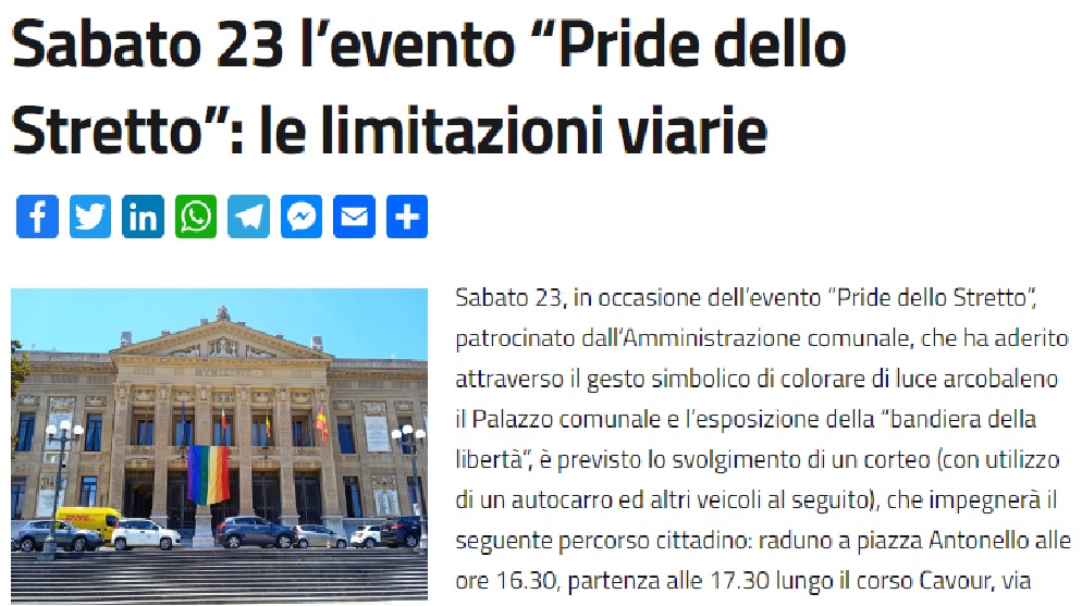 Sabato 23, in occasione dell’evento “Pride dello Stretto”, patrocinato dall’Amministrazione comunale, che ha aderito attraverso il gesto simbolico di colorare di luce arcobaleno il Palazzo comunale e l’esposizione della “bandiera della libertà”, è previsto lo svolgimento di un corteo (con utilizzo di un autocarro ed altri veicoli al seguito), che impegnerà il seguente percorso cittadino: raduno a piazza Antonello alle ore 16.30, partenza alle 17.30 lungo il corso Cavour, via Cannizzaro, carreggiata ovest (monte) di via Garibaldi fino a giungere in piazza Unione Europea, alle 20.30 circa, ove l’autocarro sosterà sulla esistente corsia riservata in adiacenza al marciapiede di piazza Unione Europea.