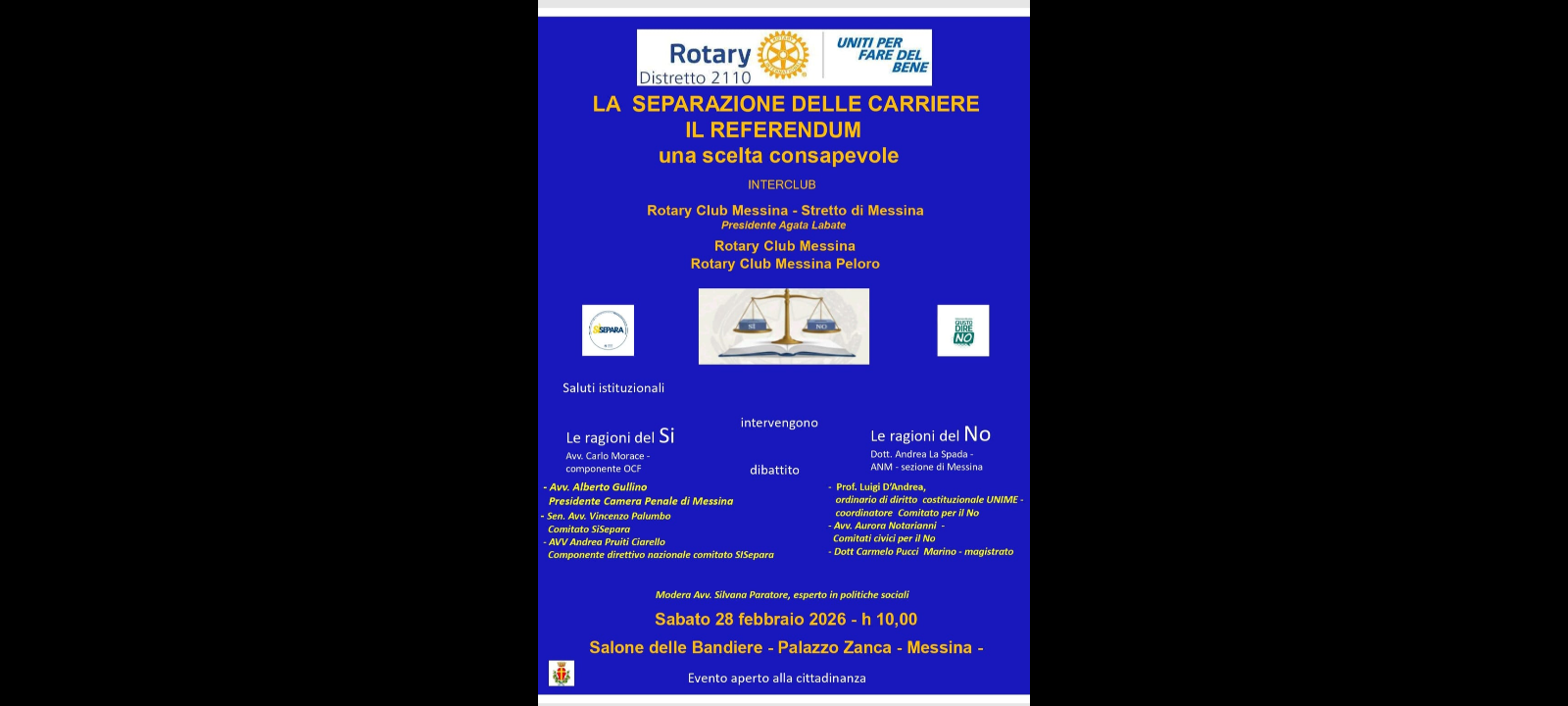 Sabato 28 febbraio 2026, alle ore 10.00, presso il Salone delle Bandiere di Palazzo Zanca, si terrà l’incontro pubblico dal titolo “La separazione delle carriere – Il referendum, una scelta consapevole”, promosso dal Rotary Club Messina – Stretto di Messina nell’ambito di un Interclub che coinvolge anche il il Rotary Club Messina e il Rotary Club Messina Peloro.