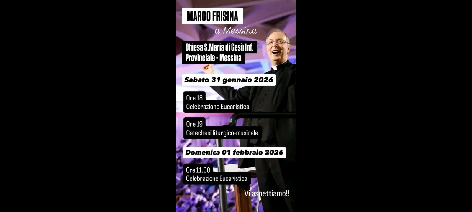 Sabato 31 gennaio 2026 alle ore 18.00, mons. Marco Frisina sarà ospite dei Missionari del Preziosissimo Sangue della Parrocchia di S. Maria di Gesù inferiore di Provinciale a Messina. Presso lo stesso luogo, domenica 01 febbraio, il prelato celebrerà l’eucaristia durante la Messa delle ore 11.00.