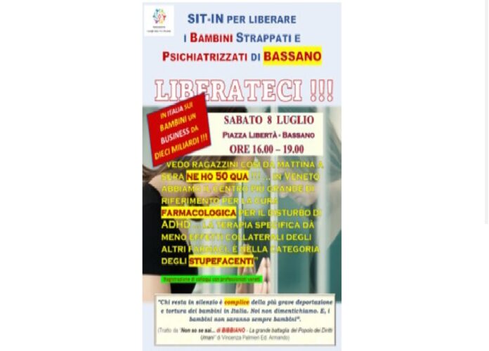 Sabato 8 Luglio in Piazza Libertà alle ore 16.00 l’Associazione Famiglie Unite per i Bambini in collaborazione con alcuni genitori del Veneto ha indetto una manifestazione per protestare contro la pratica della sottrazione dei Bambini alle Famiglie e la loro successiva psichiatrizzazione con pesanti psicofarmaci.