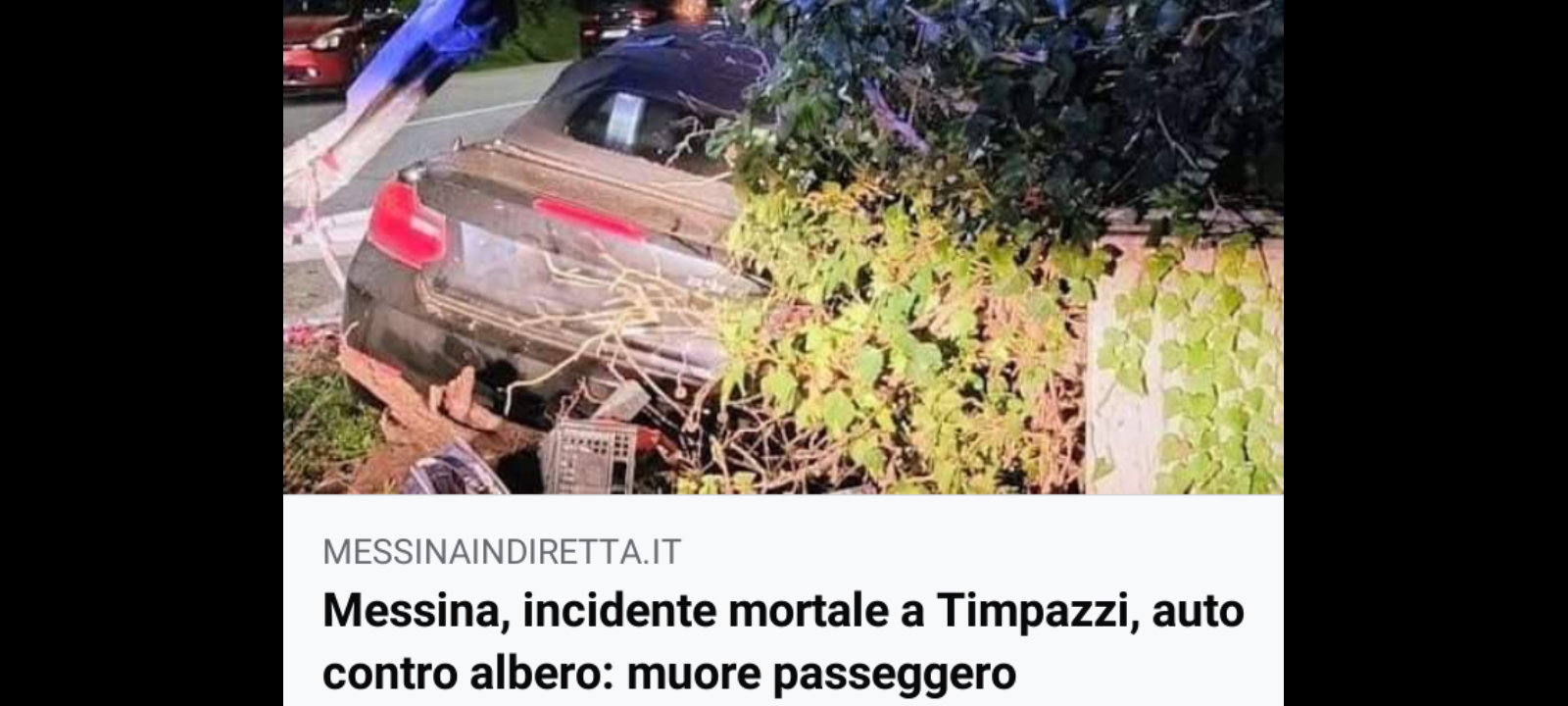 Sabato pomeriggio tragico a Timpazzi, sulla Strada Statale 113, teatro di un gravissimo incidente: un’auto è improvvisamente uscita di strada finendo contro un albero, l’impatto è costato la vita a Giorgio Pagano, 33 anni, messinese. Viaggiava sul sedile lato passeggero della vettura guidata da un amico che nello scontro è rimasto ferito.