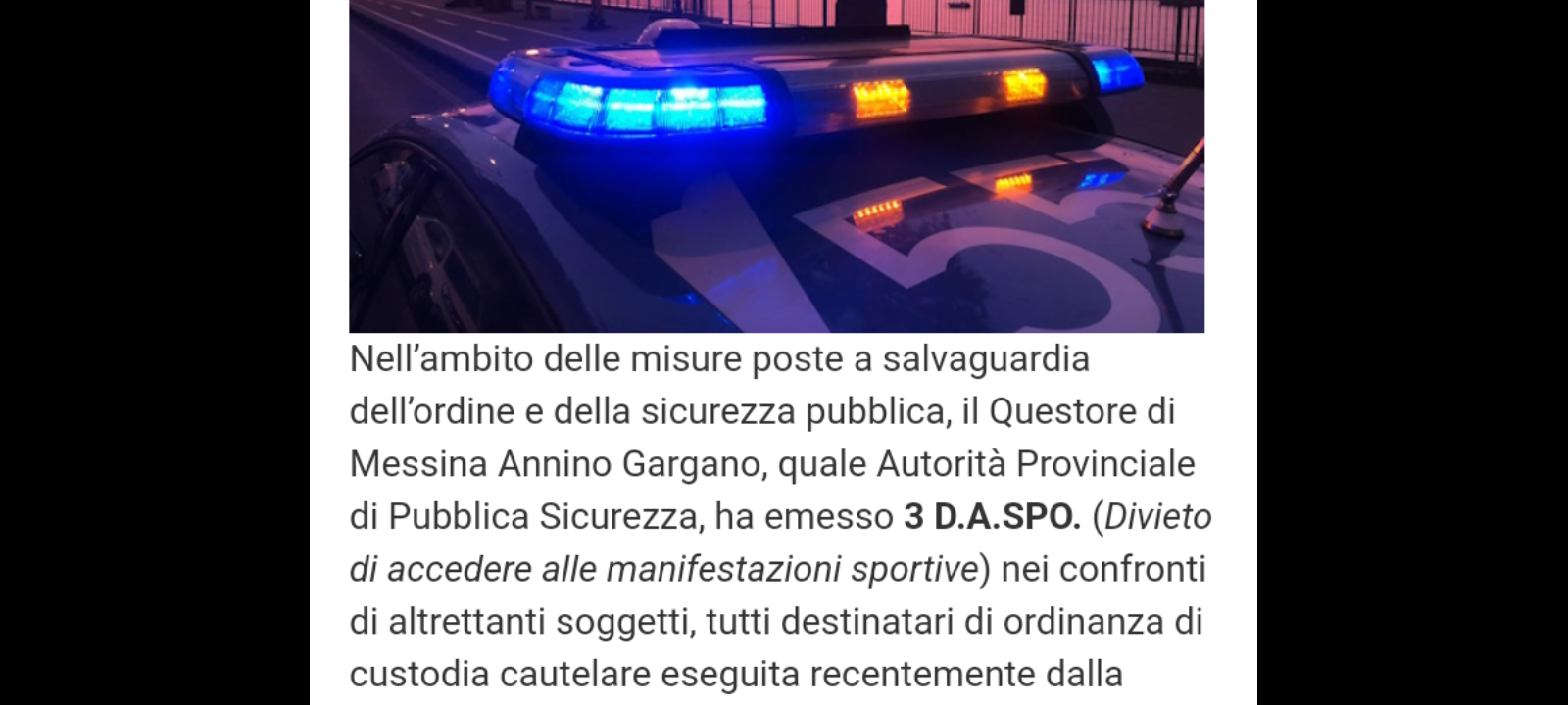 Trattasi dei così detti “D.A.SPO. fuori contesto”, scaturiti a seguito delle condotte di reato per le quali sono stati arrestati in esecuzione della predetta ordinanza di custodia cautelare: in particolare, il provvedimento del Questore è stato adottato successivamente alla assodata appartenenza dei predetti soggetti a gruppi ultras della tifoseria dell’A.C.R. Messina.