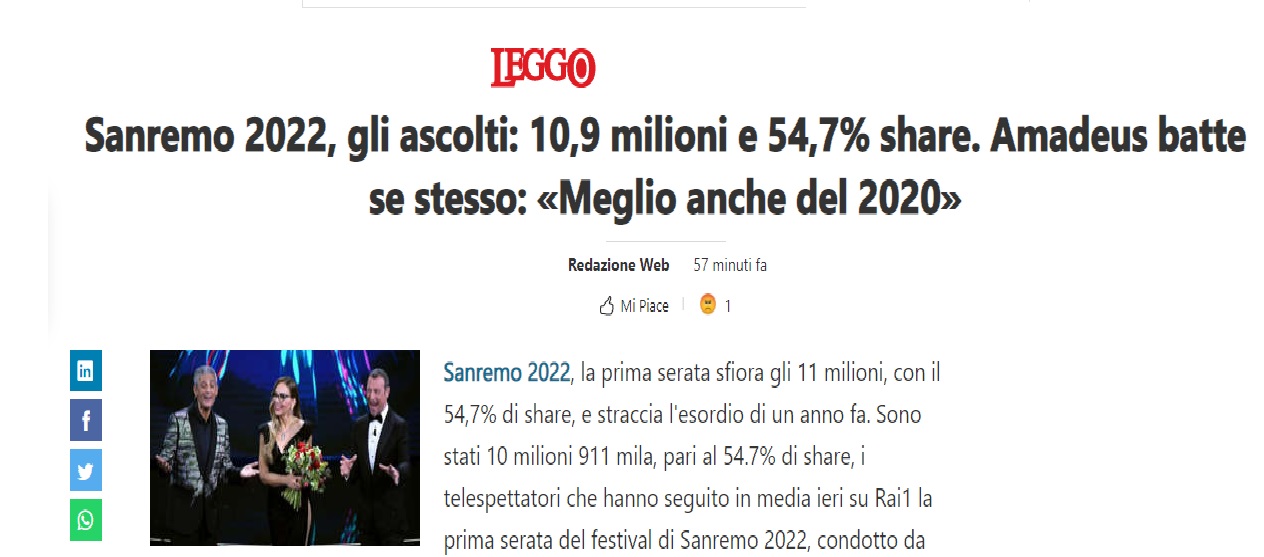 Un risultato che batte nettamente la prima serata dell’edizione 2021. L’anno scorso l’ascolto medio della prima parte era stato infatti di 8 milioni 363 mila spettatori, pari ad uno share del 46.6%. La prima parte della prima serata del festival ha avuto il 54.5% con 13 milioni 805 mila spettatori, la seconda il 55.4% con 6 milioni 412 mila. Nel 2021 la prima parte della prima serata del festival aveva fatto segnare 11 milioni 176 mila spettatori con il 46.4%, la seconda 4 milioni 212 mila con il 47.8%.