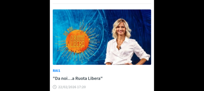 Sarà tutta dedicata alla musica, in vista di Sanremo 2026, la puntata di “Da noi… a Ruota Libera”, in onda domenica 22 febbraio alle 17.20 su Rai1. “Da noi… a Ruota Libera” è il programma condotto da Francesca Fialdini e realizzato dai membri della Direzione Intrattenimento Day Time in collaborazione con i responsabili di Endemol Shine Italy.