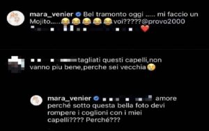 “Bel tramonto oggi… Mi faccio un mojito… voi?”, ha scritto Mara Venier come didascalia alla foto insieme al marito sulla terrazza di uno degli hotel più esclusivi di Viareggio durante la golden hour. Uno scatto sereno e spensierato che ha raccolto oltre 51mila like che, però, qualcuno non ha gradito. O meglio, un utente ha ben pensato di commentare negativamente lo scatto criticando la lunghezza dei capelli di Mara Venier. “Tagliati questi capelli, non vanno più bene, perché sei vecchia”, ha scritto una signora di una certa età. Un consiglio non richiesto, con tanto di offesa anagrafica alla padrona di casa di Domenica In, che alla conduttrice non è proprio andato giù: “Amore, perché sotto questa bella foto devi rompere i coglioni con i miei capelli? Perché?”. Pioggia di like per la risposta definitiva di Mara Venier, alla quale l’utente non ha più replicato.