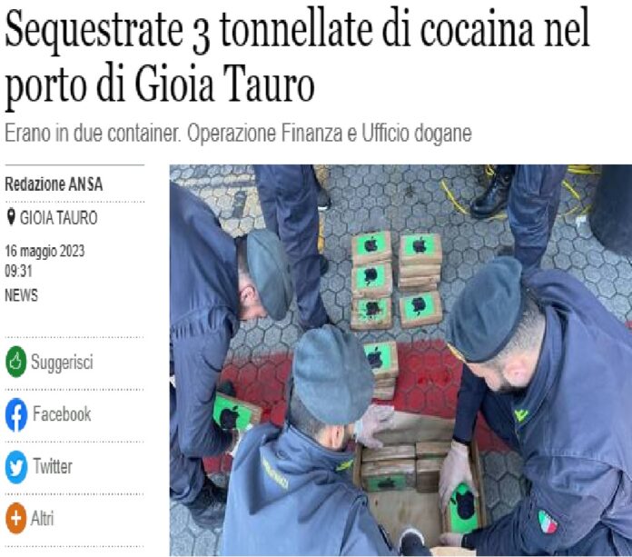 Sequestro record di cocaina nel porto di Gioia Tauro: i finanzieri del comando provinciale di Reggio Calabria ed i funzionari dell’Ufficio dogane hanno trovato in due container provenienti da Guayaquil, nell’Ecuador, e destinati in Armenia, attraverso il porto di Batumi, in Georgia, due tonnellate e 734 chilogrammi di cocaina purissima. La cocaina contenuta nei container, refrigerati e lunghi oltre 12 metri, era occultata in un carico di frutta composto da 78 tonnellate di banane. L’operazione che ha portato al sequestro delle quasi tre tonnellate di cocaina, finalizzata al contrasto del traffico internazionale di sostanze stupefacenti, è stata condotta con il coordinamento e la direzione della Direzione distrettuale antimafia di Reggio Calabria. Nel porto di Gioia Tauro, dal mese di gennaio del 2021 ad oggi, sono state sequestrate complessivamente circa 37 tonnellate di cocaina. L’operazione che ha portato al sequestro delle quasi tre tonnellate di cocaina, finalizzata al contrasto del traffico internazionale di sostanze stupefacenti, è stata condotta con il coordinamento e la direzione della Direzione distrettuale antimafia di Reggio Calabria.