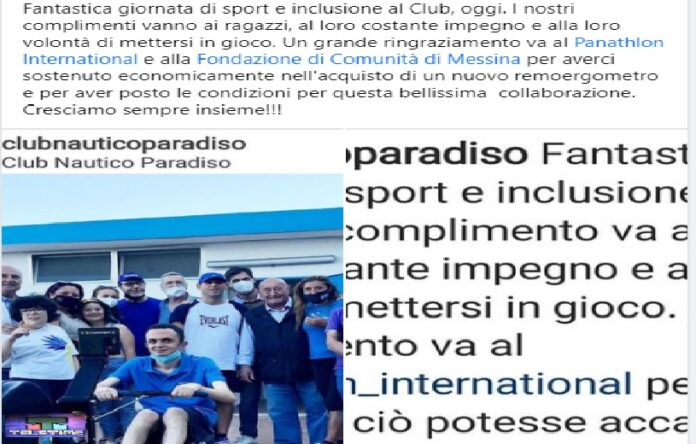 Si è svolta presso la sede del Club Nautico Paradiso di Messina una giornata di sport ed inclusione che ha visto protagonisti i componenti del club che con il loro costante impegno e volontà di mettersi in gioco hanno realizzato il progetto dell’acquisto di un remoergometro, attrezzo meccanico (noto anche semplicemente come vogatore) che simula il movimento della remata e che servirà per gli allenamenti degli atleti con disabilità che si avvicinano alla pratica sportiva del canottaggio. Il progetto, rivolto ad atleti con disabilità psicomotoria, impegnati in sessioni di allenamento, si è concretizzato grazie al determinante contributo economico del Panathlon International e della Fondazione di Comunità di Messina.