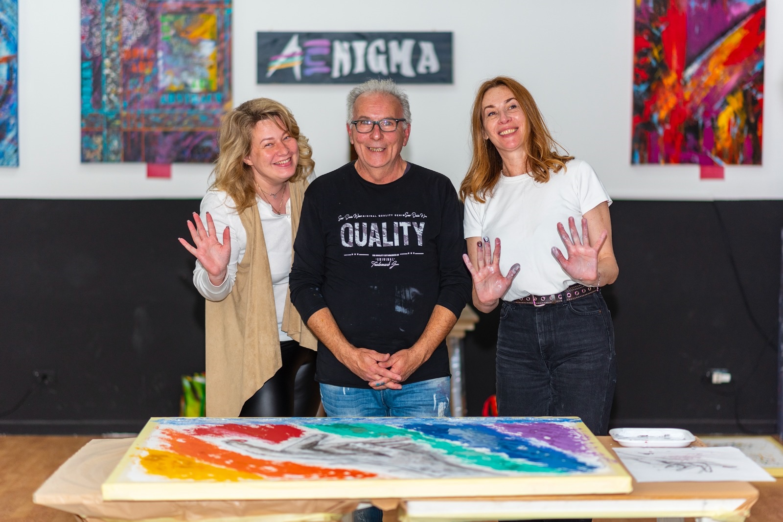 Nel corso dell’incontro, dedicato alla creatività e alla pace, si è realizzato l’incontro di due diversi stili di pittura. Francesco, con la sua personale, e ormai nota, forma espressiva ‘Astrattamente’, ha creato la texture dell’opera riproducendo la bandiera della pace stilizzata, gettando sulla tela i colori con la maestria che lo contraddistingue. Al centro uno spazio bianco che Irina ha riempito creando il suo dipinto ad effetto: una mano femminile protesa al cielo su cui è appoggiata una coccinella. L’Arte non basta mai ed è qui che il genio creativo di Francesco propone una storica stretta di mano tra Russia e Ucraina. Così, con un’azione di dripping alla Pollock, crea la trama pittorica da cui scaturisce una seconda opera. Il Maestro decide di immortalare il tumulto di emozioni che le due mani strette tra loro gli scatenano e dà libero sfogo al suo genio creativo.