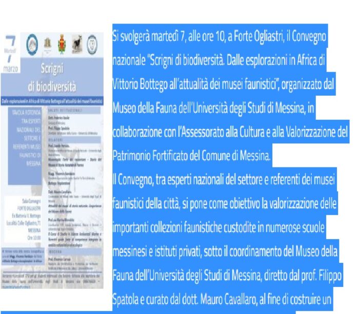 Il Convegno, tra esperti nazionali del settore e referenti dei musei faunistici della città, si pone come obiettivo la valorizzazione delle importanti collezioni faunistiche custodite in numerose scuole messinesi e istituti privati, sotto il coordinamento del Museo della Fauna dell’Università degli Studi di Messina, diretto dal prof. Filippo Spatola e curato dal dott. Mauro Cavallaro, al fine di costruire un percorso scientifico e didattico, da inserire tra i percorsi turistico-culturali da proporre. Il Museo di Storia Naturale dell’Università di Parma ospita un’importante sezione dedicata al Capitano Vittorio Bottego, esploratore del Regio Esercito che operò in Africa nel tardo Ottocento, e a cui, tra le due guerre mondiali, fu intitolato Forte Ogliastri.