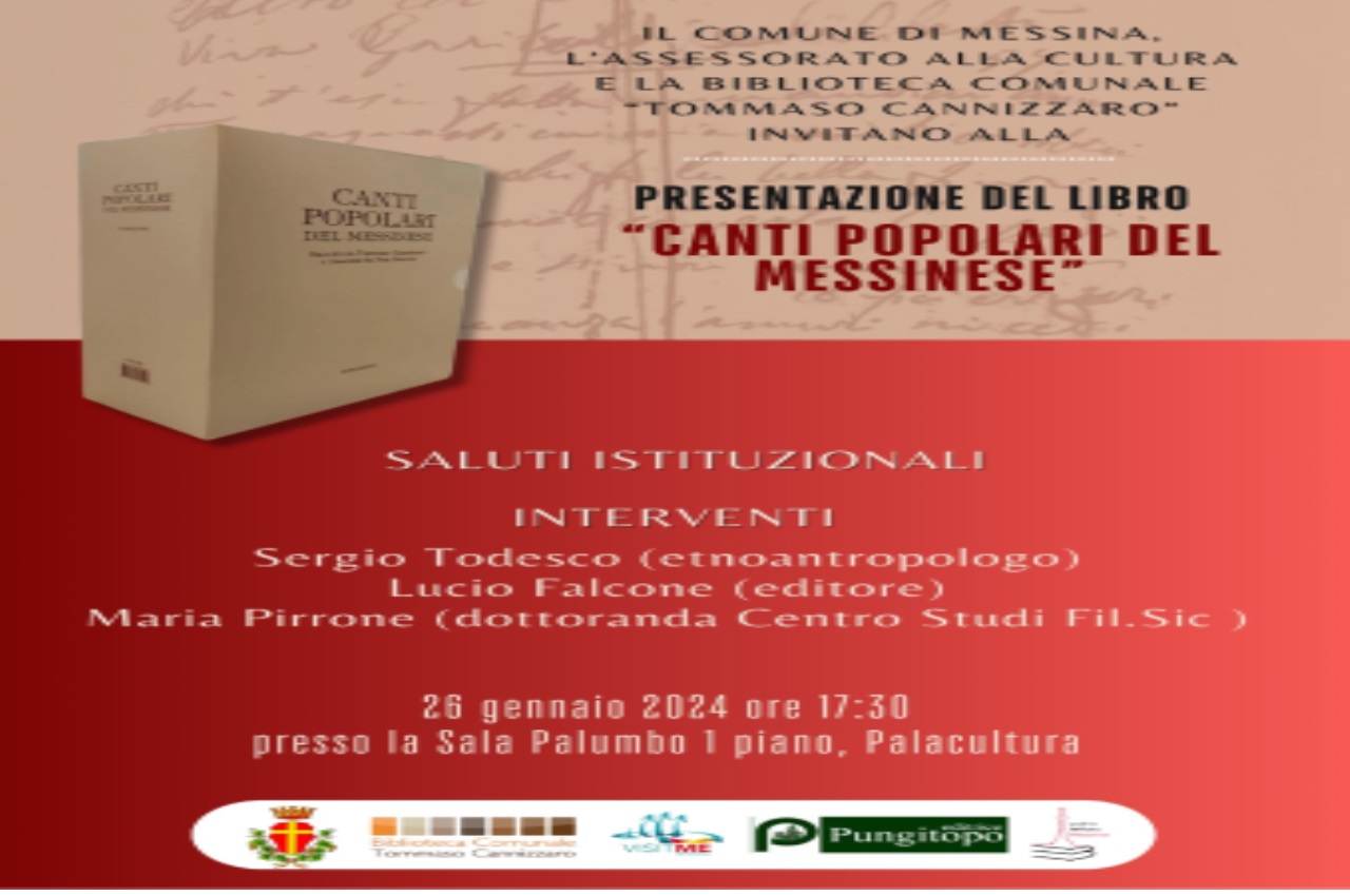 Si terrà venerdì 26 gennaio, alle ore 17.30, presso la Sala Palumbo del Palazzo della Cultura “Antonello da Messina” la presentazione del volume “I Canti popolari del messinese” di Tommaso Cannizzaro (ed. Pungitopo 2023).