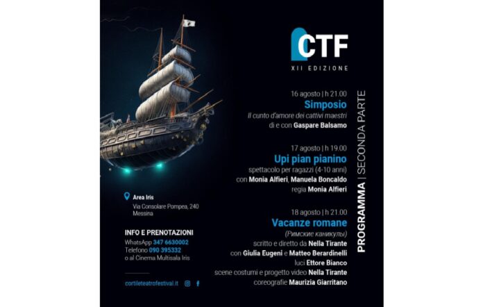Si trasferisce nell’Area Iris di Ganzirri per la sua tre giorni conclusiva (dal 16 al 18 agosto) e chiuderà con un’altra prima nazionale. Il Cortile Teatro Festival di Messina, diretto da Roberto Zorn Bonaventura, non finisce mai di sorprendere. Cominciamo dalla fine. “Vacanze romane”, scritto e diretto dalla messinese (di Nizza Sicilia) Nella Tirante, andrà in scena per la prima volta (venerdì 18 agosto, ore 21) dopo lo studio parziale presentato al festival romano “InDivenire”, diretto da Giampiero Cicciò.