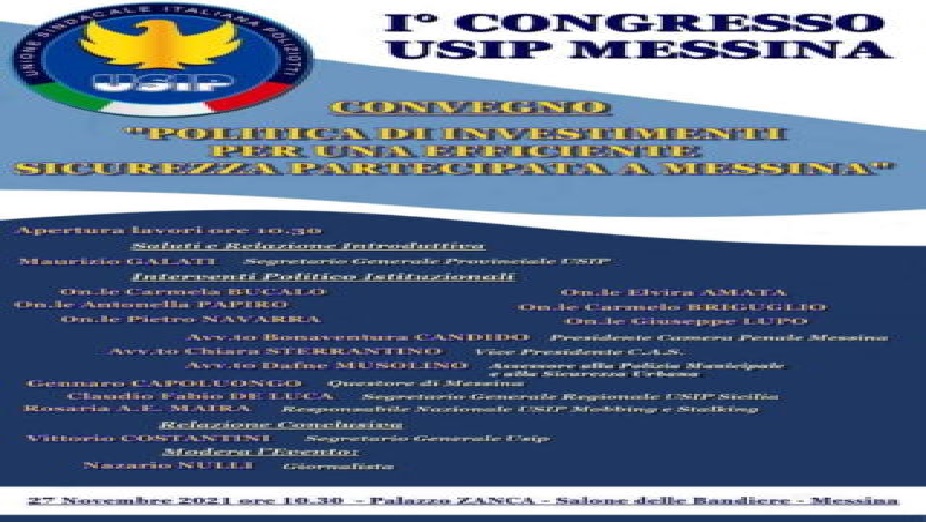 L’obiettivo del convegno è aprire un confronto a 360 gradi sugli investimenti nel settore sicurezza a Messina affrontando le criticità e proponendo idee, soluzioni e programmazione per i futuri investimenti. Esponenti politici ed istituzionali, amministrazione comunale e sindacati avranno la possibilità di confrontarsi sulle prospettive a breve, medio e lungo termine. Introdurrà il dibattito il segretario generale USIP Messina Maurizio Galati che illustrerà nuovi scenari per la politica di investimenti per la sicurezza cittadina.