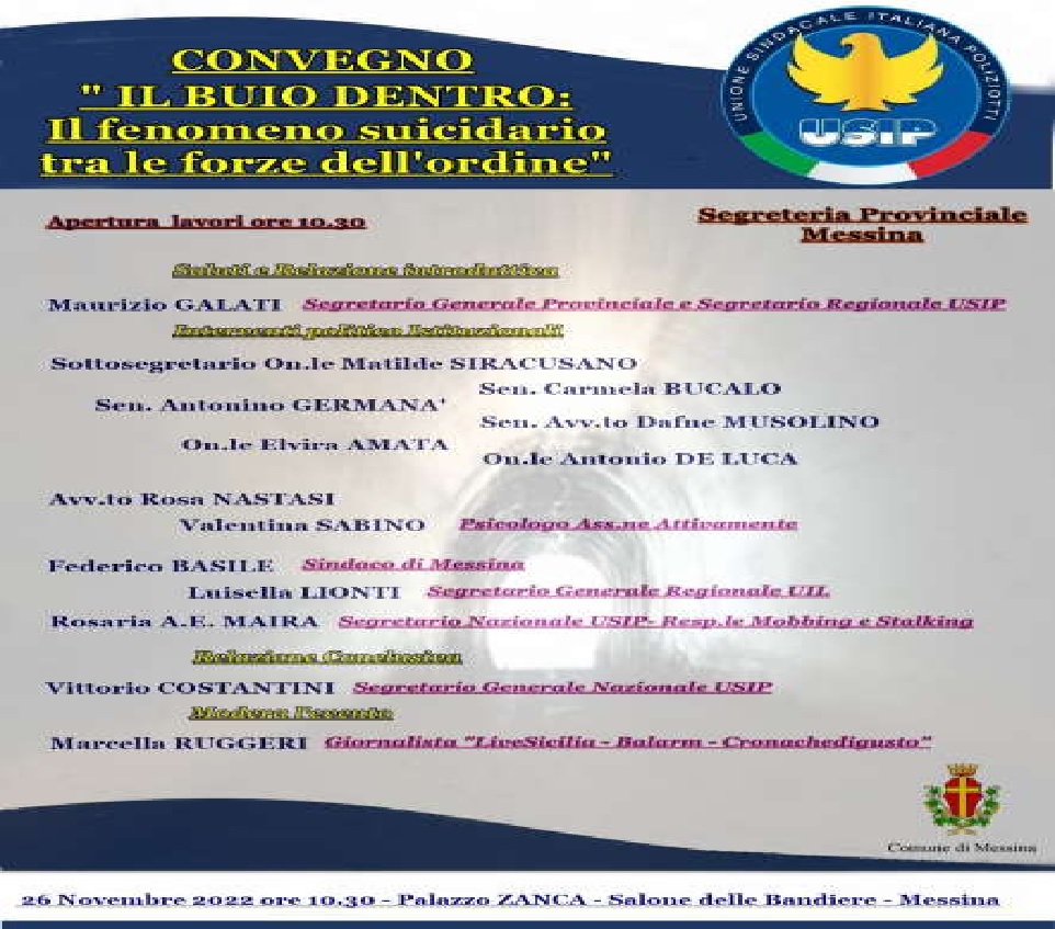 La Maira organizza, insieme al Segretario Generale Provinciale e Regionale Usip Maurizio Galati, una tavola rotonda dal titolo “Il BUIO DENTRO: fenomeno suicidario tra le Forze dell’Ordine”, prevista il prossimo 26 novembre, alle ore 10: 30, nel Salone delle Bandiere del Comune di Messina. Ad essere chiamate a partecipare tutte le componenti dirigenziali di Usip della Penisola, della regione e della provincia di Messina. La delicatezza dell’argomento richiede un parterre di spessore che sia destinato a trasmetterne i contenuti agli organi istituzionali della capitale.
