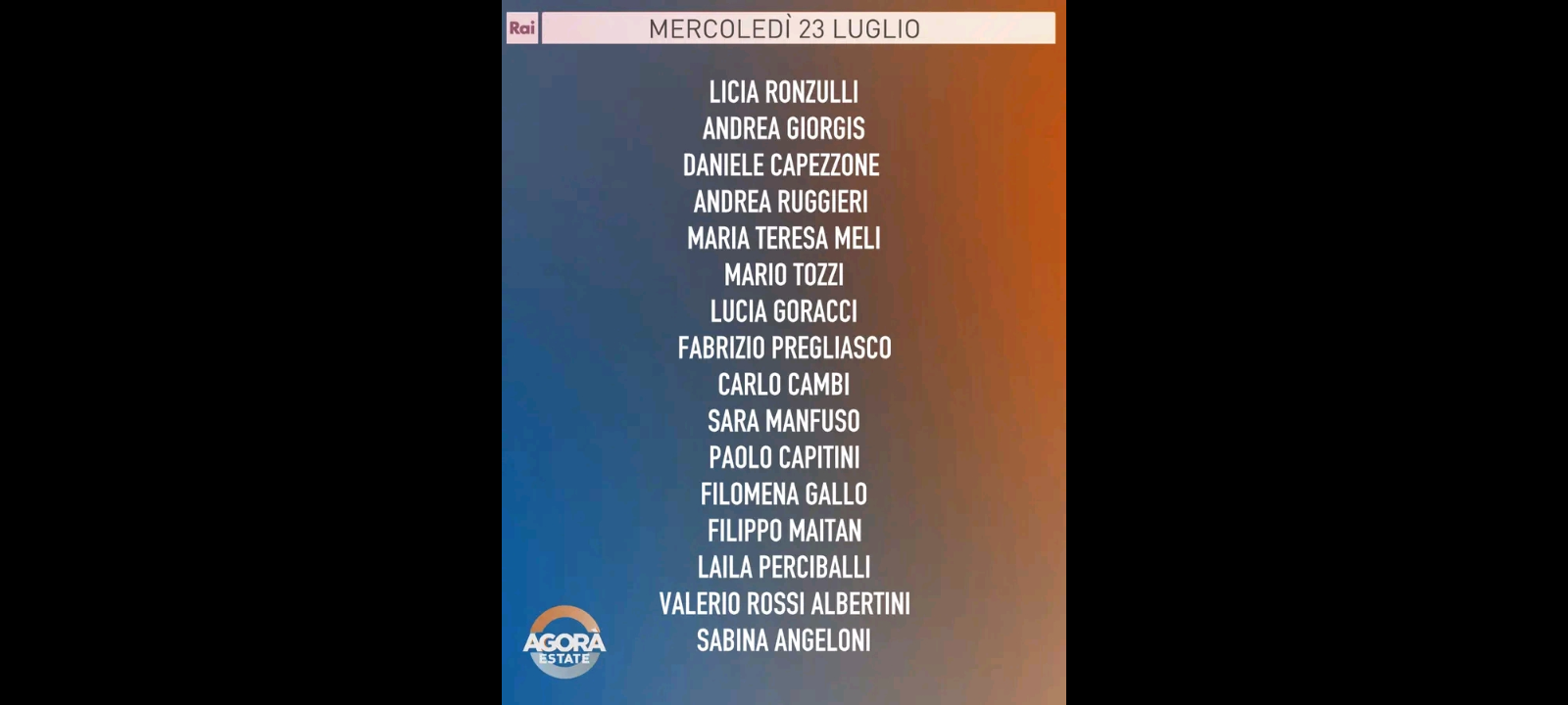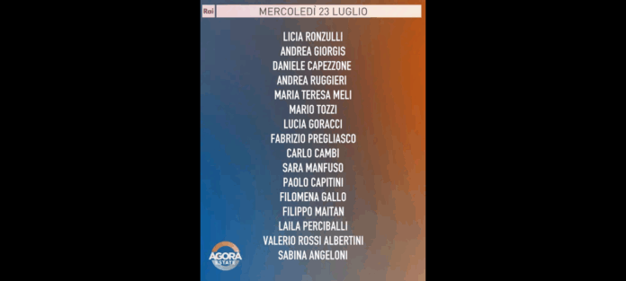 ‘Sono almeno 51, secondo fonti mediche, i palestinesi uccisi nelle ultime ore dall‘esercito israeliano nella Striscia di Gaza. Tra loro ci sono 14 palestinesi che erano alla ricerca di aiuti. “Le immagini di Gaza sono insopportabili, bisogna finirla”, ha detto su X Ursula Von Der Leyen; politica e giustizia: scontro altissimo dopo l’inchiesta che ha scosso Milano e con l’approvazione da parte del Senato della separazione delle carriere; allerta caldo: al sud si attendono “fiammate” fino a 45 gradi, i consigli e i metodi per evitare che le temperature altissime possano creare problemi alla salute’. Questi i principali temi della puntata di Agorà Estate, in onda mercoledì 23 luglio alle 8.00 su Rai3, condotta da Giulia Di Stefano con Marco Carrara.