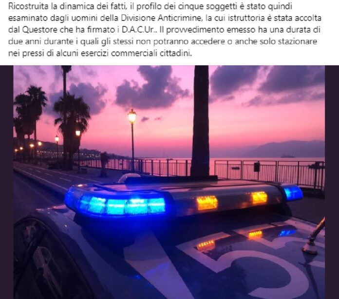 Ricostruita la dinamica dei fatti, il profilo dei cinque soggetti è stato quindi esaminato dagli uomini della Divisione Anticrimine, la cui istruttoria è stata accolta dal Questore che ha firmato i D.A.C.Ur.! Il provvedimento emesso ha una durata di due anni durante i quali gli stessi non potranno accedere o anche solo stazionare nei pressi di alcuni esercizi commerciali cittadini.