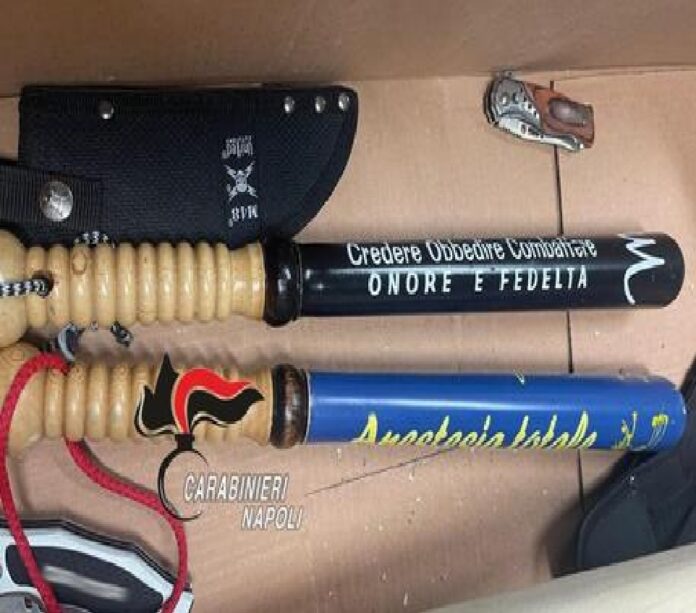 Complessivamente sono 33 le misure cautelari emesse dal gip: 32 sono state notificate, nelle province di Napoli, Caserta, Salerno, Cosenza, Ragusa e Caltanissetta. Al momento manca all’appello uno degli indagati. I carabinieri, durante le notifiche dei provvedimenti, hanno sequestrato anche una pistola pronta all’uso e due manganelli in legno, riportanti lo slogan “Credere, Obbedire, Combattere”, sui quali si stanno facendo ulteriori accertamenti. Trovati e sequestrati anche sei coltelli, un’ascia, una lama artigianale, una piccozza, una multilama “ninja”.