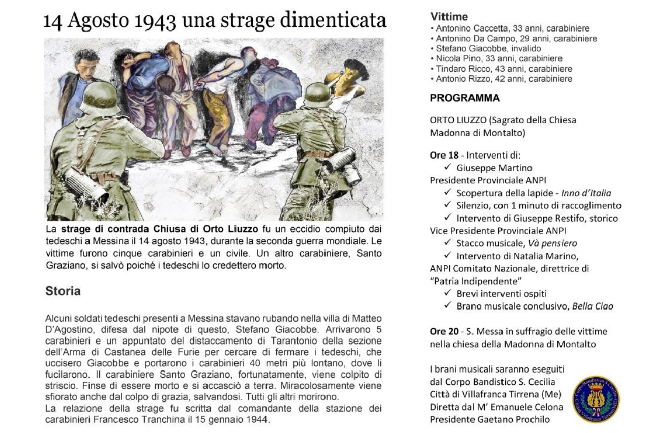 Sono passati ottant’anni ma la gente di Orto Liuzzo e di Divieto, nel messinese, si tramanda la memoria di quanto è avvenuto lì il 14 agosto del 1943, mentre a livello ufficiale calava il silenzio: cinque carabinieri e un civile vennero fucilati dai tedeschi in contrada Chiusa del villaggio tirrenico, vittime innocenti di un atto di barbarie. Lunedì 14 agosto prossimo l’Anpi di Messina scoprirà una lapide in ricordo dei sei uccisi… i carabinieri Antonino Caccetta, Antonino Da Campo, Nicola Pino, Tindaro Ricco, Antonio Rizzo, e il civile Stefano Giacobbe. La cerimonia si svolgerà sul sagrato della chiesa della Madonna di Montalto di Orto Liuzzo, a partire dalle ore 18.