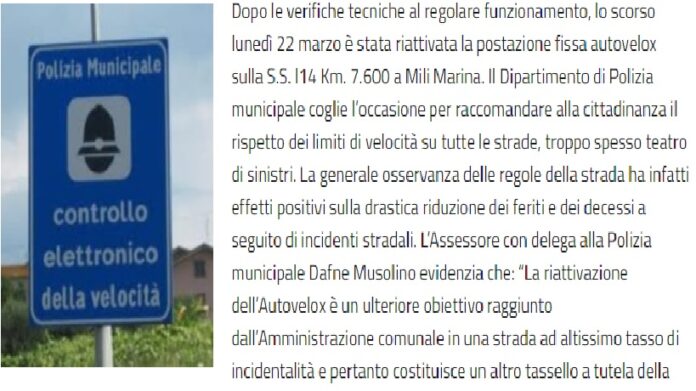 Dopo le verifiche tecniche al regolare funzionamento, lo scorso lunedì 22 marzo è stata riattivata la postazione fissa Autovelox sulla S.S. l14 Km. 7.600 a Mili Marina. Il Dipartimento di Polizia municipale coglie l’occasione per raccomandare alla cittadinanza il rispetto dei limiti di velocità su tutte le strade, troppo spesso teatro di sinistri. La generale osservanza delle regole della strada ha infatti effetti positivi sulla drastica riduzione dei feriti e dei decessi a seguito di incidenti stradali.