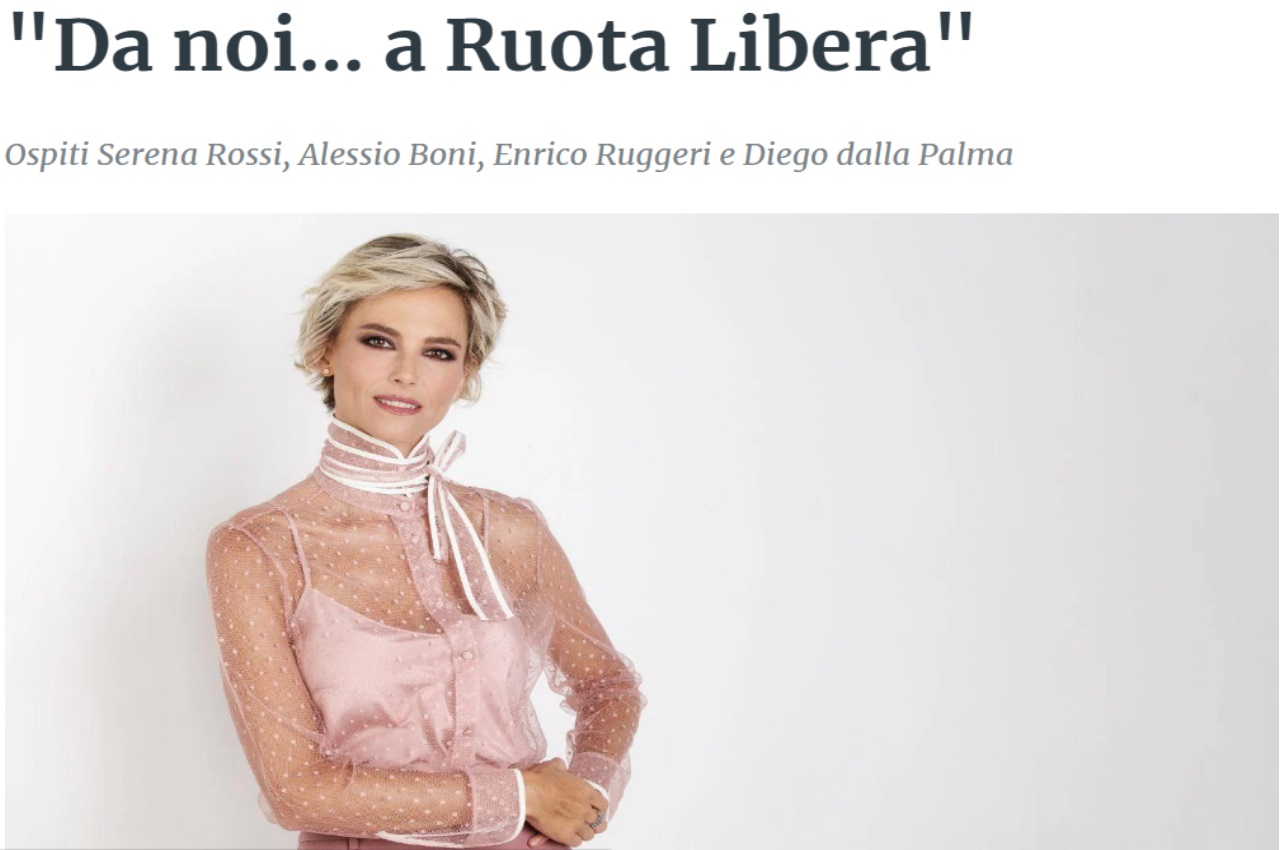 Sono Serena Rossi, Alessio Boni, Enrico Ruggeri e Diego dalla Palma gli ospiti di Francesca Fialdini nel nuovo appuntamento con “Da noi… a Ruota Libera”, il programma realizzato dalla direzione Intrattenimento Day Time in collaborazione con Endemol Shine Italy, in onda domenica 10 dicembre alle 17.20 su Rai 1.