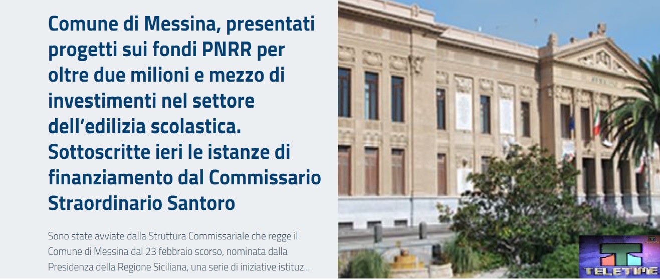 Sono state avviate dalla Struttura Commissariale che regge il Comune di Messina dal 23 febbraio scorso, nominata dalla Presidenza della Regione Siciliana, una serie di iniziative istituzionali finalizzate alla partecipazione ai bandi PNRR per l’edilizia scolastica riguardanti scuole e palestre. Il Commissario Straordinario Leonardo Santoro ha condiviso e sottoscritto le istanze che Palazzo Zanca ha proposto, a valere sugli avvisi nell’ambito del PNRR, Missione 4 – Istruzione e Ricerca – Componente 1, per un ammontare omnicomprensivo di risorse destinate dal Ministero e pari a 5,2 miliardi.
